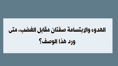 الهدوء والابتسامة صفتان مقابل الغضب، متى ورد هذا الوصف؟ يعد هذا السؤال من الأسئلة المتداولة بين الطلاب في مادة اللغة…